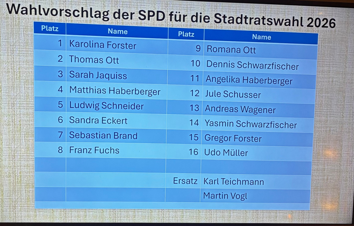 Unsere Kandidatinnen und Kandidaten für den Stadtrat 2026 1. Karolina Forster 2. Thomas Ott 3. Sarah Jaquiss 4. Matthias Haberberger 5. Ludwig Schneider 6. Sandra Eckert 7. Sebastian Brand 8. Franz Fuchs 9. Romana Ott 10. Dennis Schwarzfischer 11. Angelika Haberberger 12. Jule Schusser 13. Andreas Wagener 14. Jasmin Schwarzfischer 15. Gregor Forster 16. Udo Müller